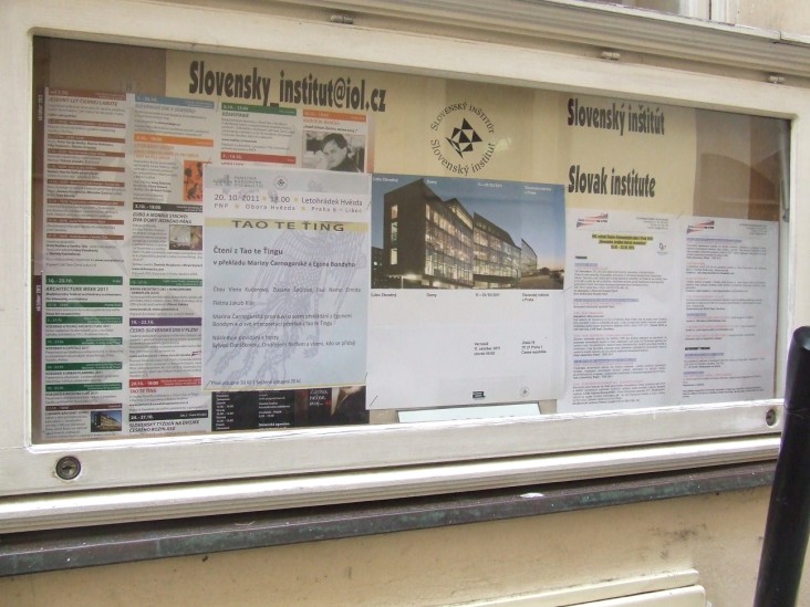 The sign on the building reads: The Slovak Institute. When you go inside, you'll find lots of information about Slovakia, about our culture, and many notices about the upcoming exhibitions of Slovak artists and many other events.