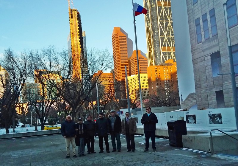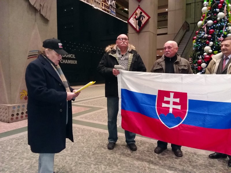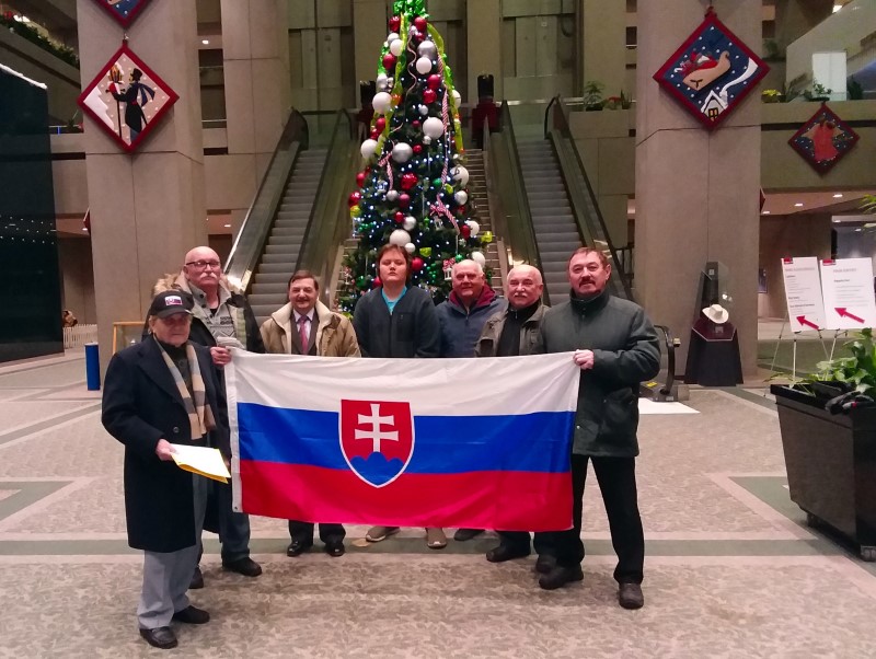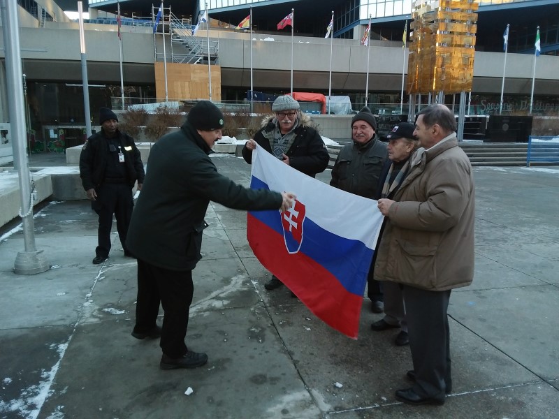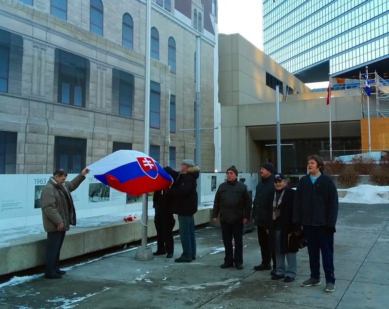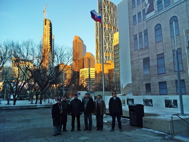 A group of Slovaks from Calgary commemorated the 26th anniversary of the independence of the Slovak Republic by raising the Slovak flag on the Flagpole of honor at Calgary City Hall. As required by the city's rules, the ceremony must start at sunrise so that the flag will fly in the center of this Canadian metropolis for the whole day.
