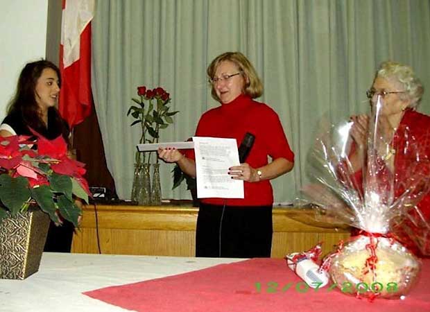 December 7, 2008 - Tanya Chandik receiving the $1000 scholarship from CSL President Mary Ann Doucette at the Montreal Branch 2 Christmas Dinner at St. Cyril and Method hall. Also in the picture is Branch presdient Lydia Matúsky.