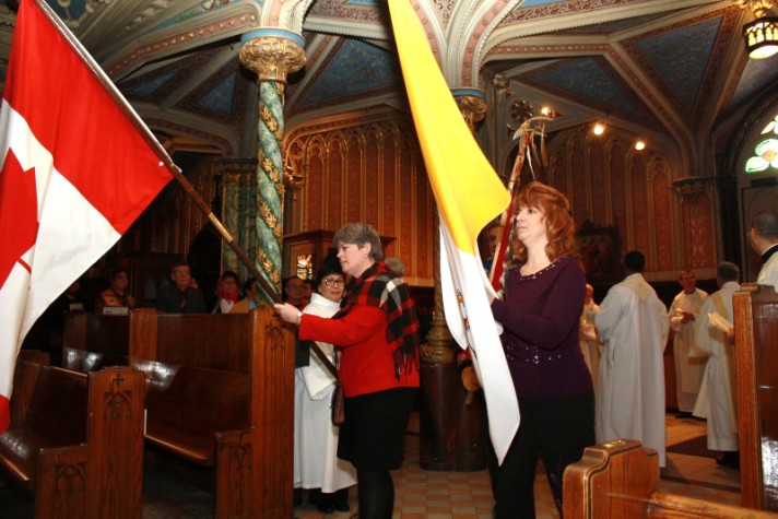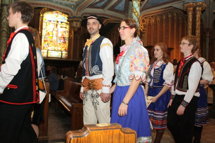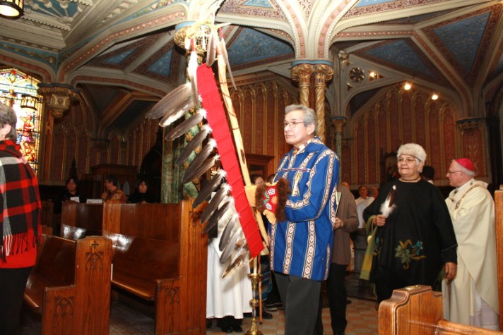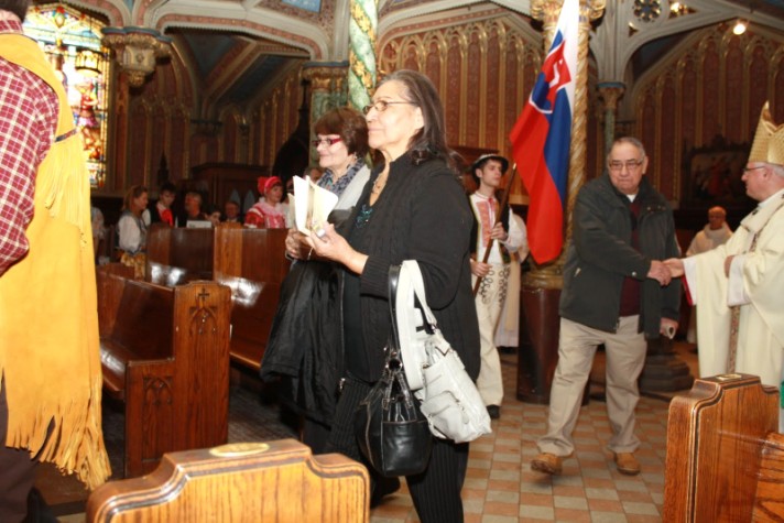 Slovakia's delegation, featuring quite a mixture of young and old devotees, was the second one in the parade of national Catholics that entered the Cathedral and went down the main aisle to just in front of the altars. The number one, as usual, was Canada's aboriginal group, with their colorful feather decorations and a picture of Canada's female aboriginal saint, Kateri Tekakwitha.
