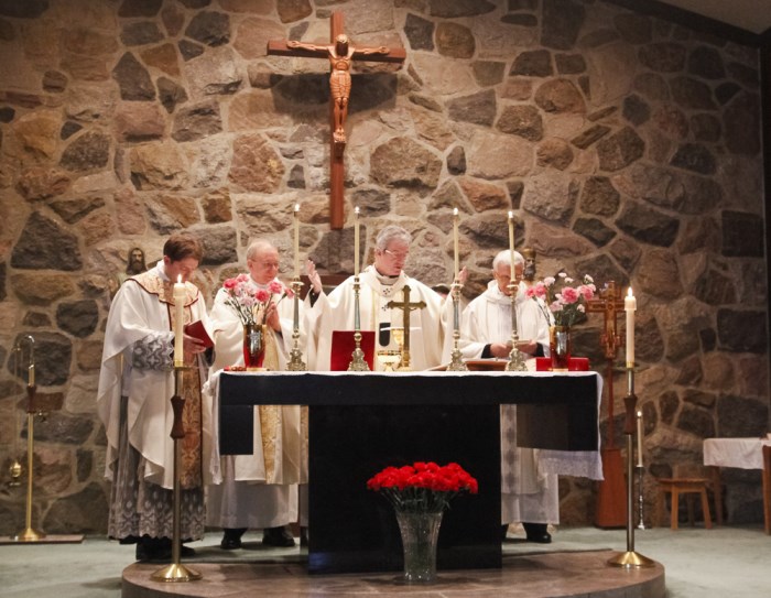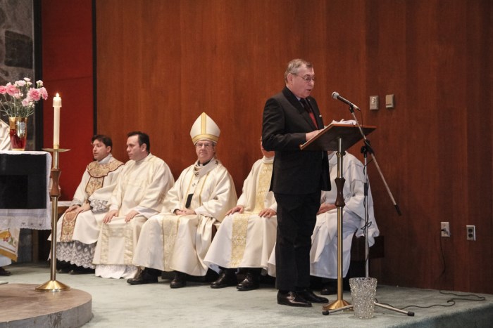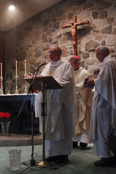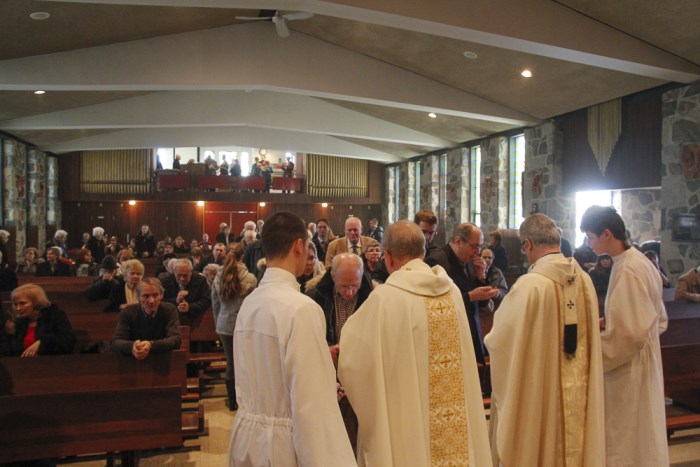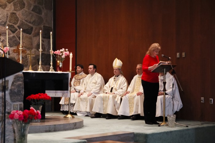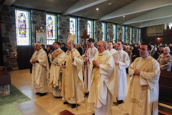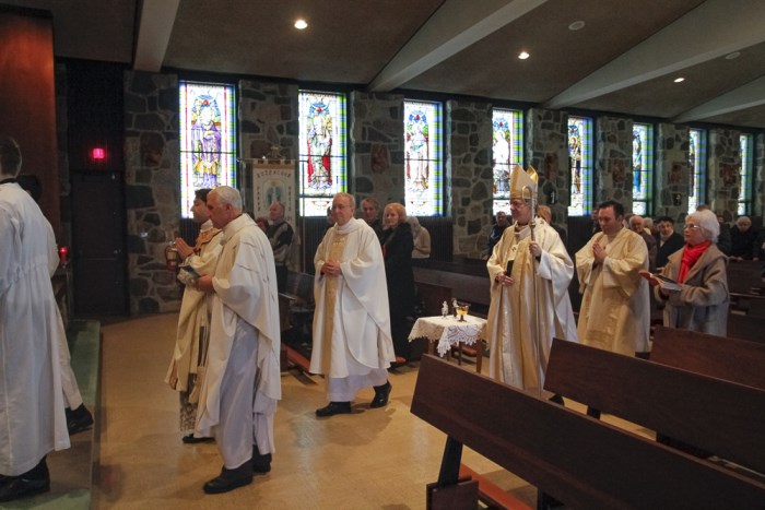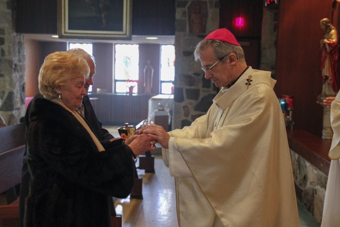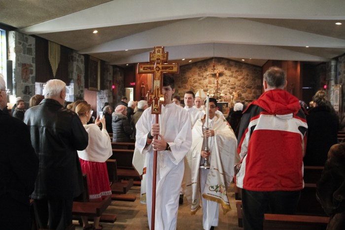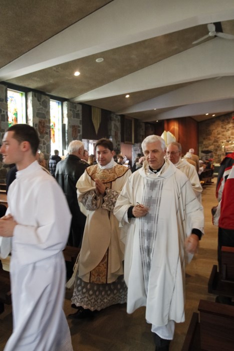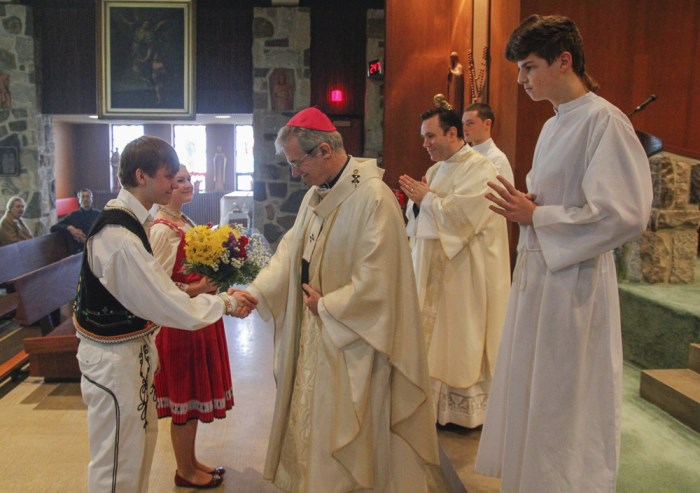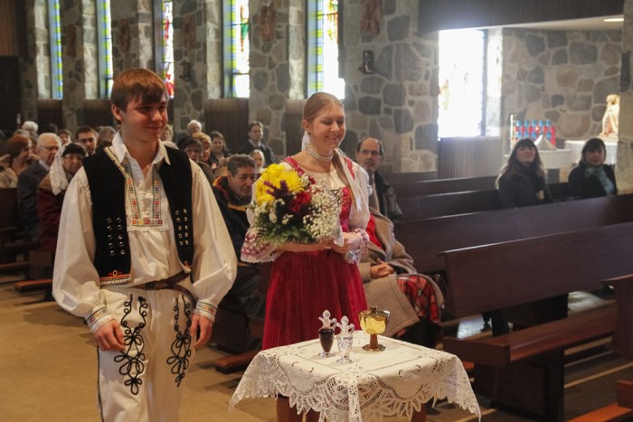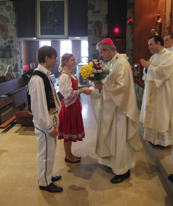 Nebolo tomu inak ani v nedeľu 16. februára t. r., ibaže sv. omša mala oveľa slávnostnejší charakter. Celebroval ju hosť najvzácnejší a najvyznámnejší, najvyšší predstaviteľ katolíckej cirkvi v Montreale, J. E. Arcibiskup Christian Lepine. Pri slávnostnej sv. omši koncelebroval náš nový pán farár Rudolf Grega, o. Peter Sabbath, pastoračný administrátor farnosti sv. Cyrila a Metoda, a o. Gabriel Juruš. Návšteva bola o to významnejšia, lebo ho poctil svojou navštevou diecézny arcibiskup. Sandra Turek a Jakub Paluš, oblečení v slovenských krojoch, privítali Jeho Excelenciu arcibiskupa s kyticou kvetov. Omša bola slávená v troch jazykoch, slovenčine, angličtine a francúzštine.