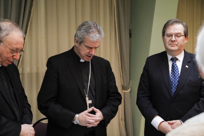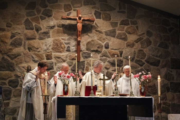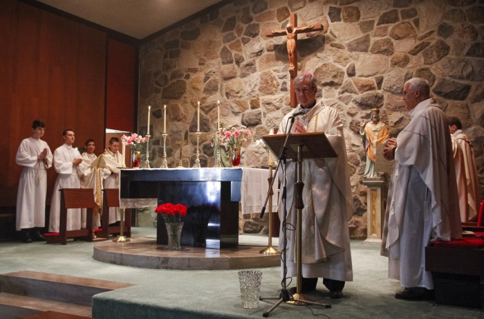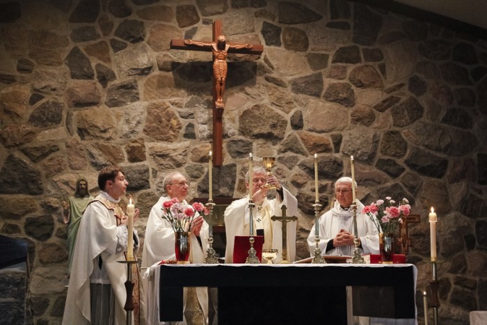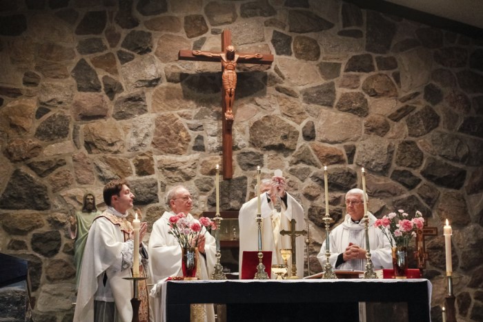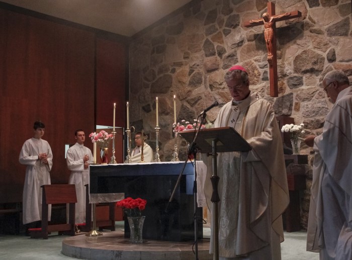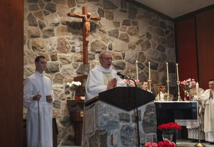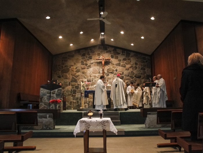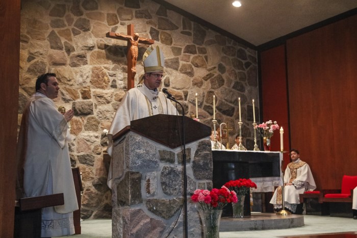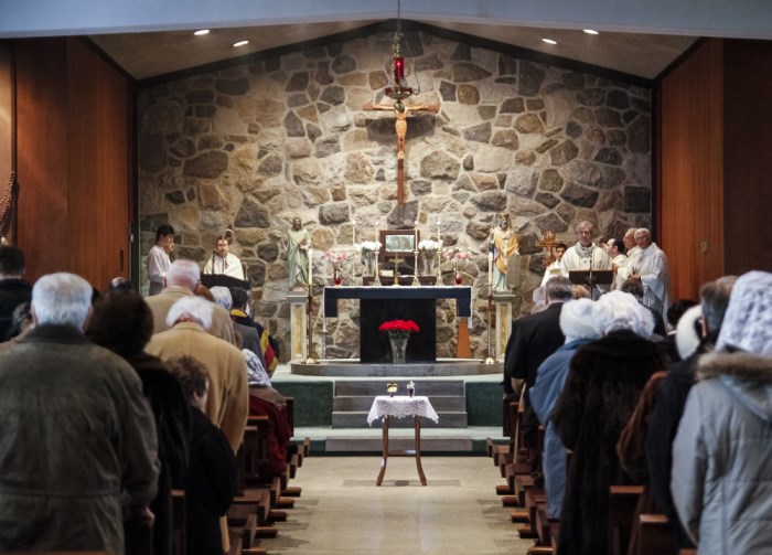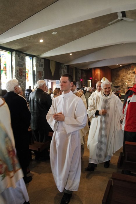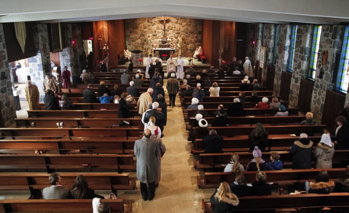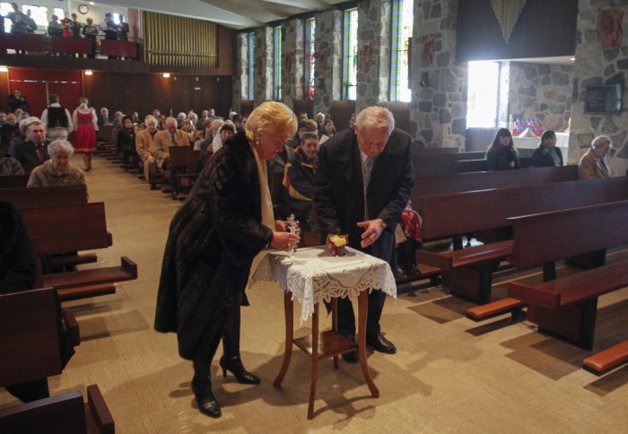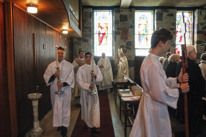 Nebolo tomu inak ani v nedeľu 16. februára t. r., ibaže sv. omša mala oveľa slávnostnejší charakter. Celebroval ju hosť najvzácnejší a najvyznámnejší, najvyšší predstaviteľ katolíckej cirkvi v Montreale, J. E. Arcibiskup Christian Lepine. Pri slávnostnej sv. omši koncelebroval náš nový pán farár Rudolf Grega, o. Peter Sabbath, pastoračný administrátor farnosti sv. Cyrila a Metoda, a o. Gabriel Juruš. Návšteva bola o to významnejšia, lebo ho poctil svojou navštevou diecézny arcibiskup. Sandra Turek a Jakub Paluš, oblečení v slovenských krojoch, privítali Jeho Excelenciu arcibiskupa s kyticou kvetov. Omša bola slávená v troch jazykoch, slovenčine, angličtine a francúzštine.
