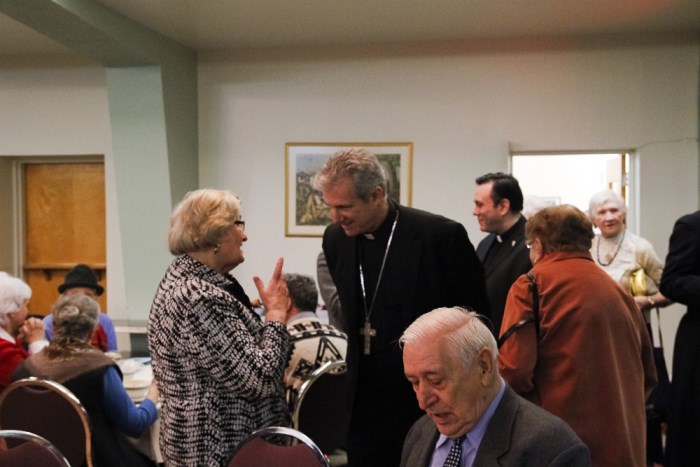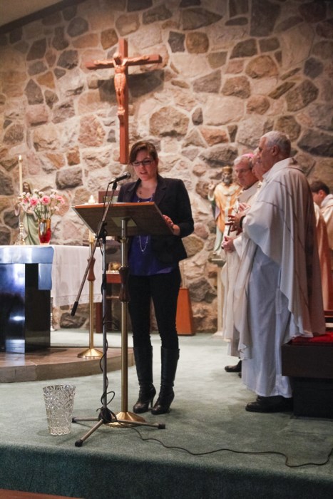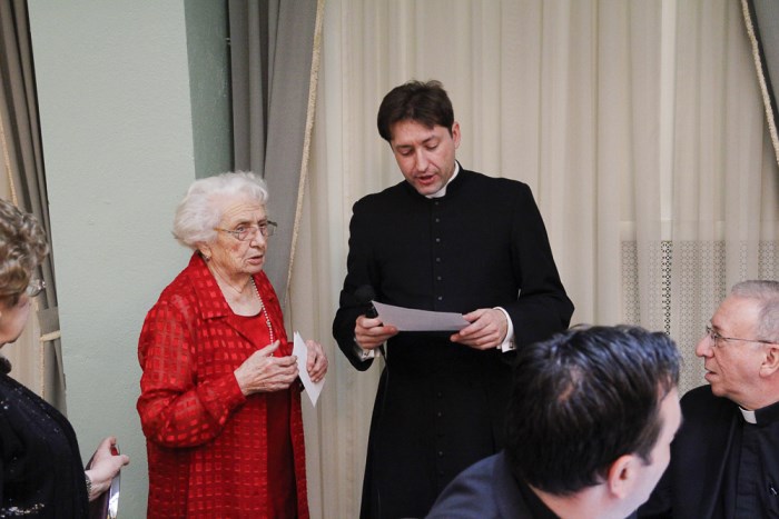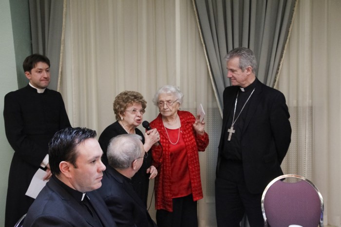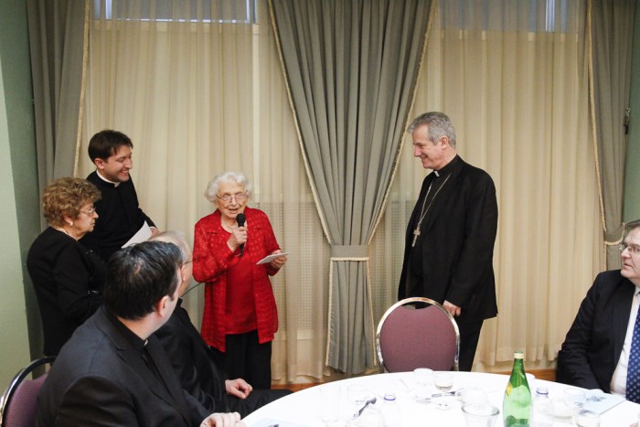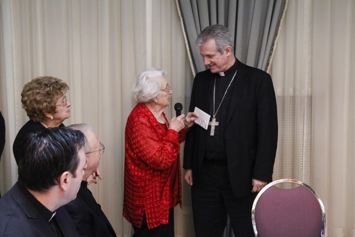 Predsedníčka 2. zboru KSL v Montreale, Lýdia Matusky, pozdravila arcibiskupa so štedrými darmi od zboru ako aj od Slovenského domu.