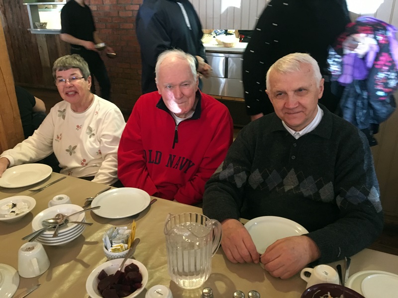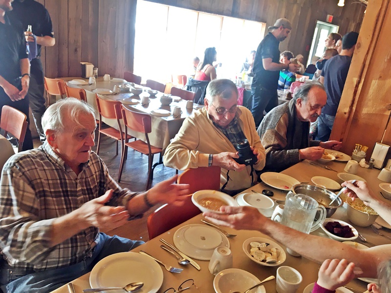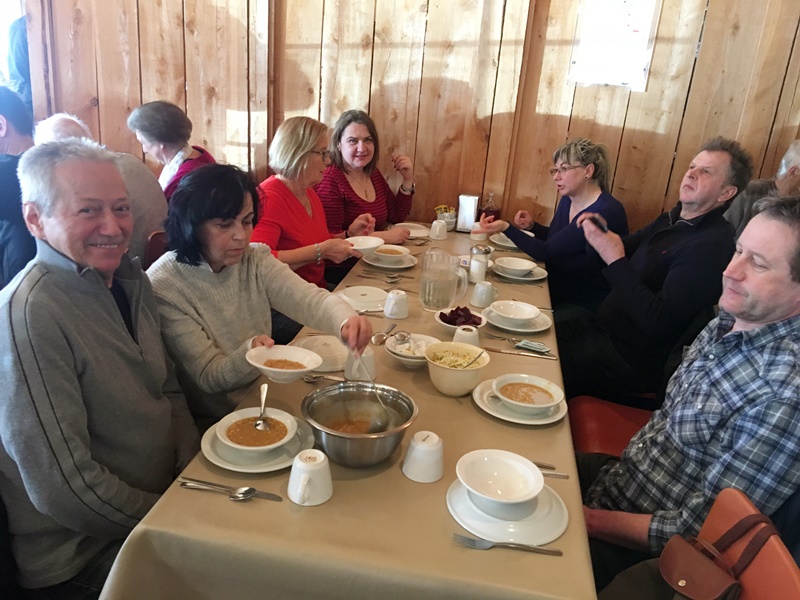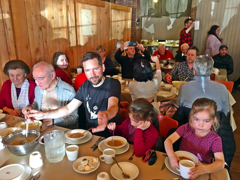 Vyhladnutých nás konečne usadili ku stolom a začali nosiť typické dobroty quebeckých predkov: výbornú hrachovú polievku, šunku, párky, zemiačky, slaninku a veľký výber zákuskov.